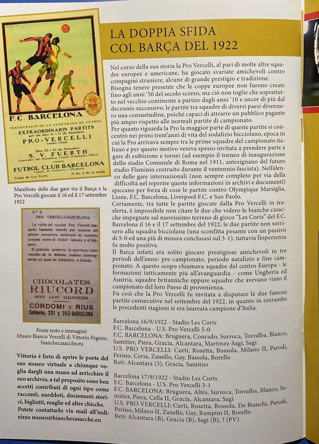 Certamente, tra tutte le partite giocate dalla Pro Vercelli in trasferta, è impossibile non citare le due che videro le bianche casacche impegnate sul nuovissimo terreno di gioco "Les Corts" del F.C.